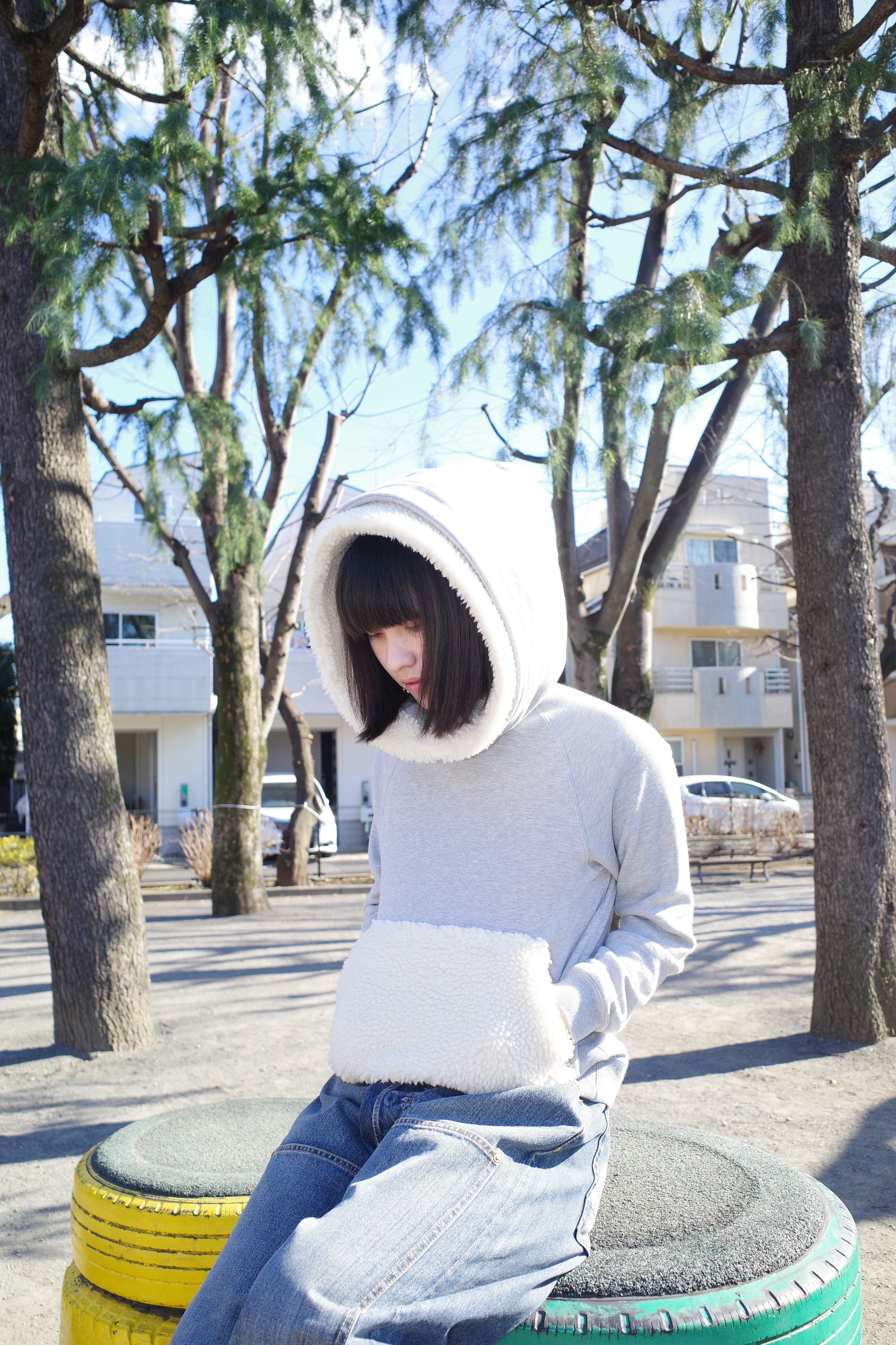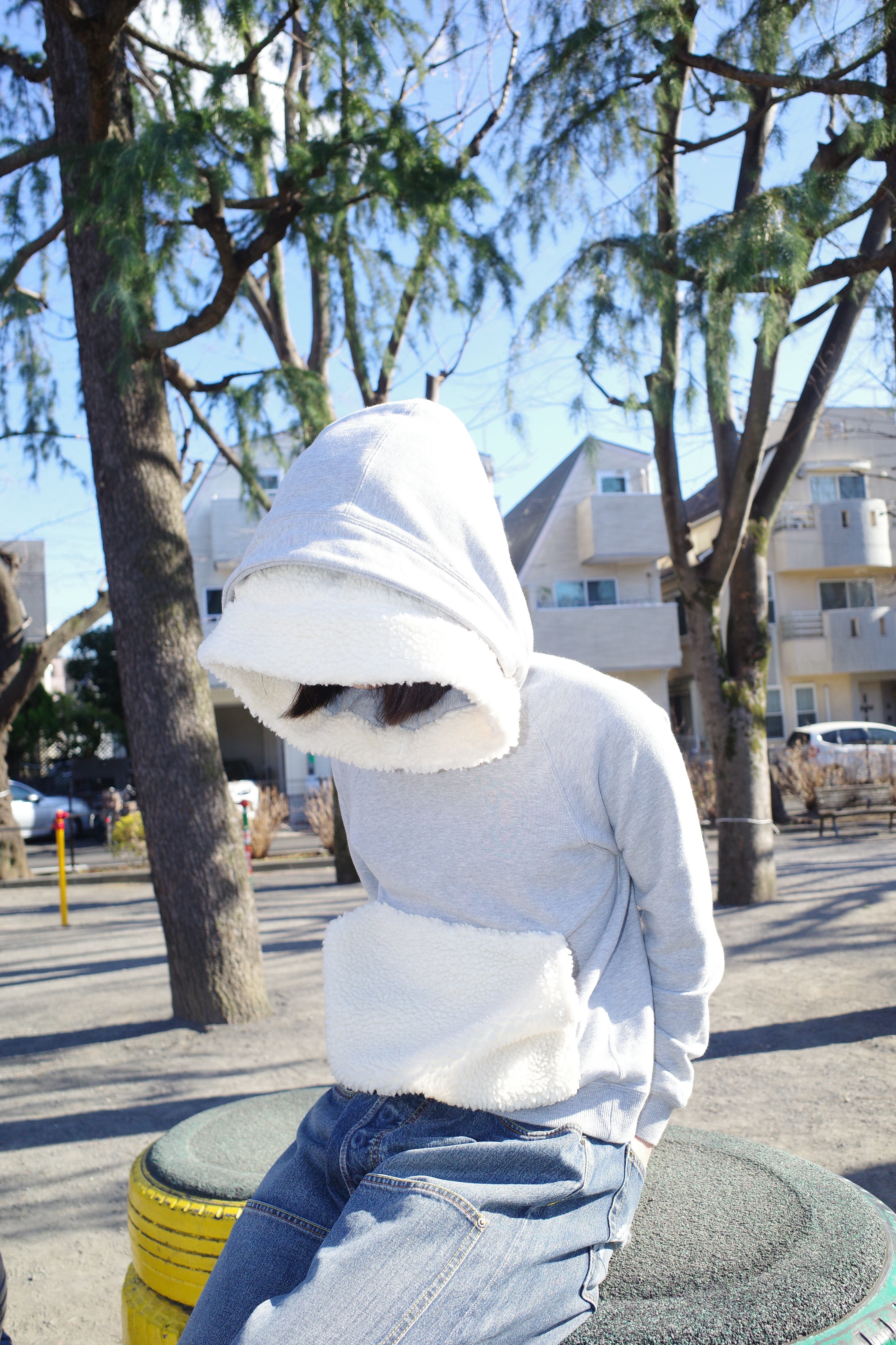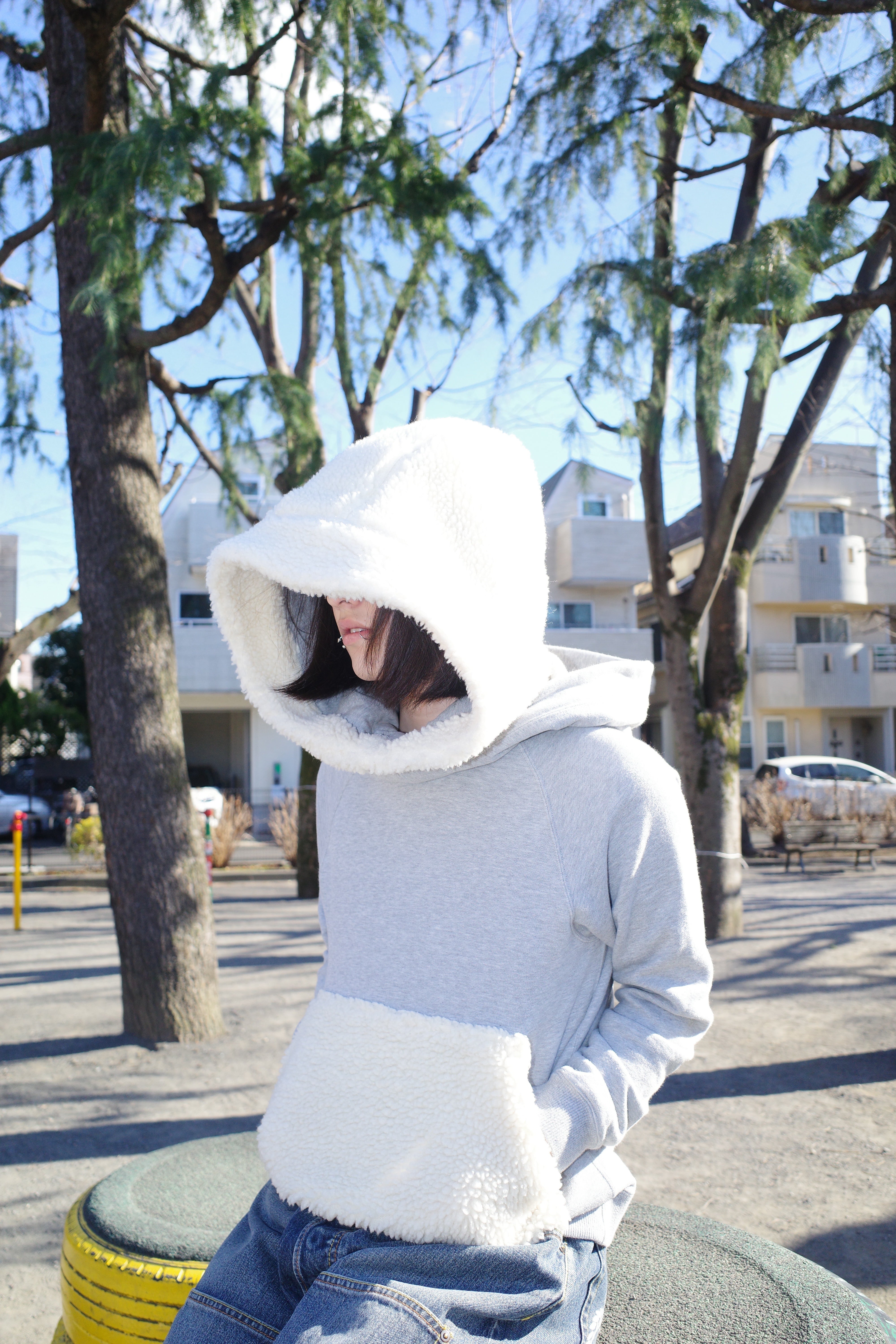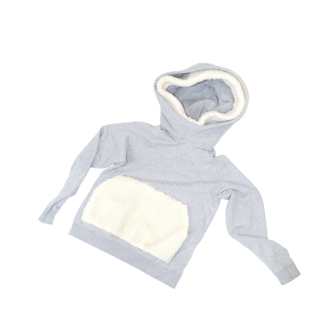 ボリューミーなボアとスウェット二重のフード。