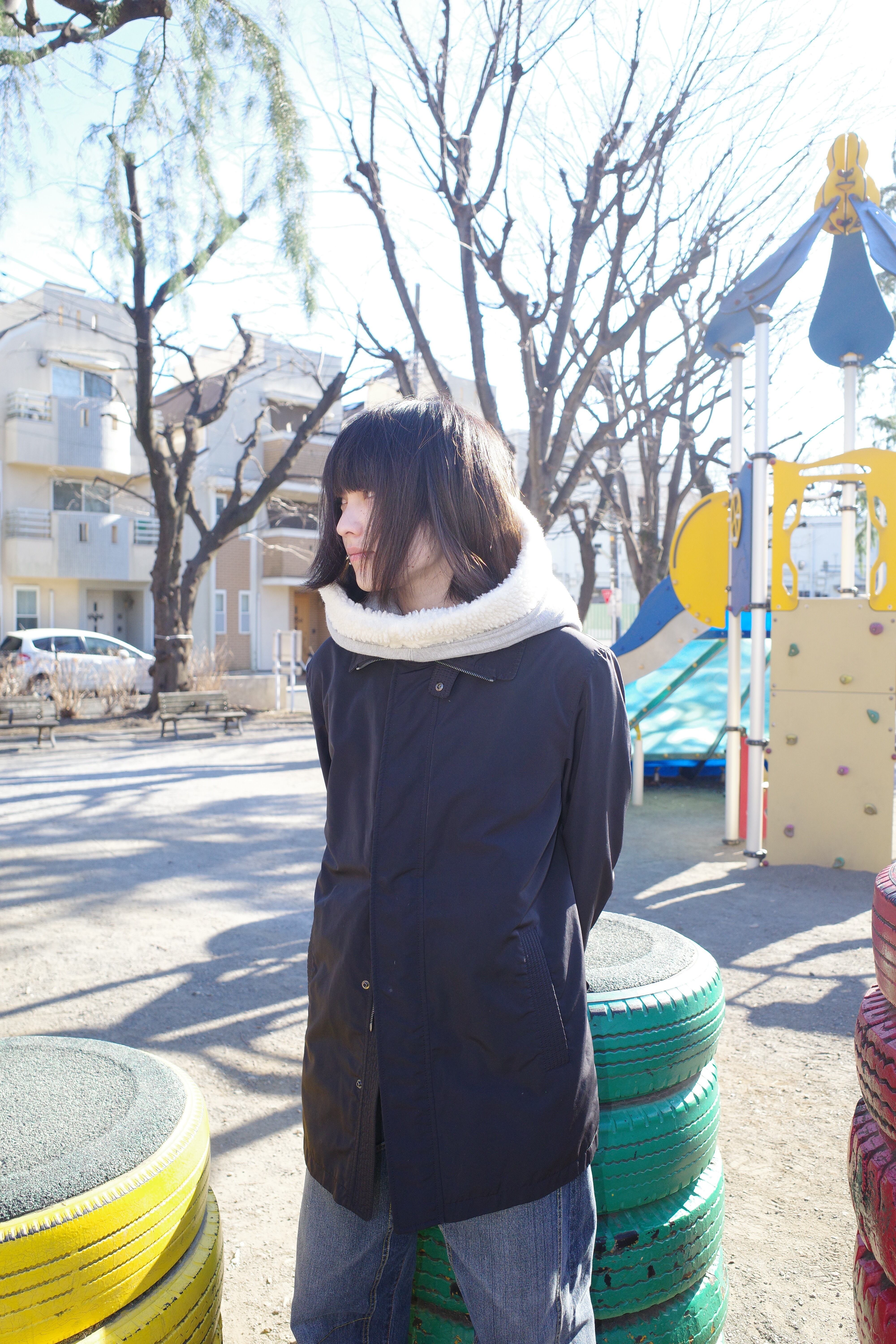 に対して、すっきりしたボディなので上からの羽織りものも色々試せます。